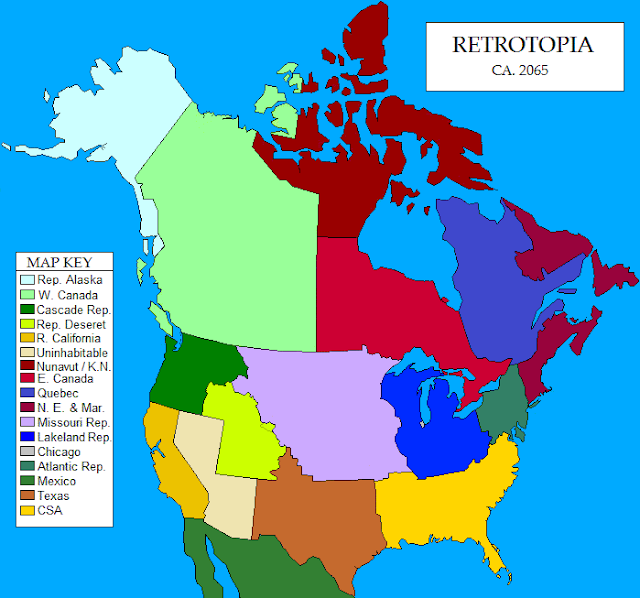 Over at The Archdruid Report, John Michael Greer has been writing a series called "Retrotopia." The first chapter was posted about November of last year and the series has had about its twentieth chapter posted. So I thought I'd make a little map of North America at about that time. Mr. Greer gave me the following pointers: